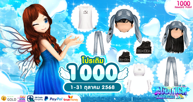 รับไอเทมง่ายๆ เพียงแค่เติมเงินเข้าเกมโดยตรงผ่านช่องทาง Razer Gold PIN, Truemoney, QR Code, M-Card, Paypal เฉพาะราคา 1,000 บาท อย่างน้อย 1 รายการ รับไอเทมถาวร (รับได้ 1 ครั้งต่อไอดีและไอเทมที่ได้รับจะส่งไปยัง MY ITEM เมื่อกดรับของรางวัล) ชวนเพื่อนๆมาใส่ชุดมุ้งมิ้งกันนะ